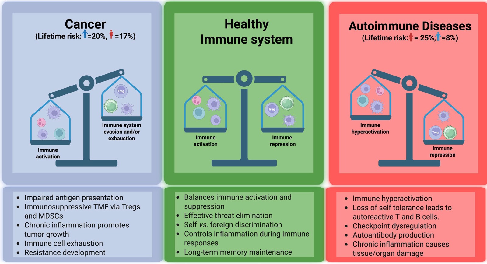 La autoinmunidad y el cáncer representan un paradoja inmunológica donde el mismo sistema puede ser simultáneamente hipervigilante y ciego. La comprensión de estos mecanismos compartidos demuestra que el equilibrio entre la activación y la represión inmunitaria es extremadamente delicado. Identificar los umbrales críticos que separan una respuesta protectora contra el cáncer de una patológica contra uno mismo es fundamental para el desarrollo de una nueva generación de terapias de precisión que logren controlar ambos procesos sin desencadenar el otro. Esta revisión explora la intrincada interacción entre la autoinmunidad y el cáncer, centrándose en la vigilancia inmunitaria, la regulación de puntos de control, la señalización de citocinas y la susceptibilidad genética. Physiol Rev , 1 de abril de 2026