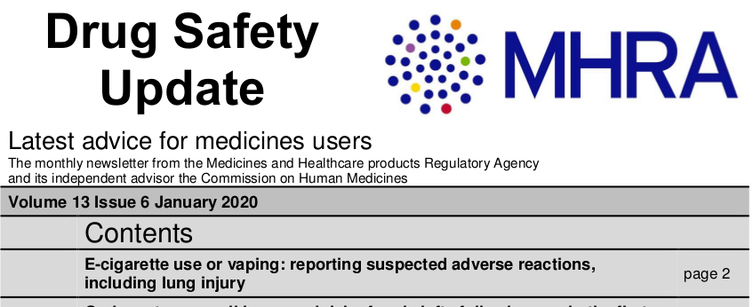 Uso de cigarrillos electrónicos o vapeo, Ondansetrón: pequeño aumento del riesgo de hendiduras orales, Mecasermina (Increlex ▼): riesgo de neoplasia. MHRA, 28 de enero de 2020