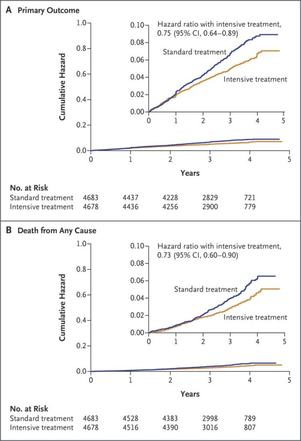 Entre los pacientes con un mayor riesgo cardiovascular, apuntar a una presión arterial sistólica de menos de 120 mm Hg obtuvo menores tasas de eventos cardiovasculares adversos mayores y una menor mortalidad por todas las causas que apuntar a una presión arterial sistólica de menos de 140 mm Hg, ambos durante recepción de la terapia asignada al azar y después del ensayo. Las tasas de algunos eventos adversos fueron más altas en el grupo de tratamiento intensivo. N Engl J Med, 20 de mayo de 2021