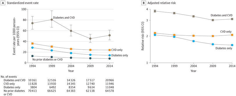 Tendencias en la asociación entre diabetes y eventos cardiovasculares, 1994-2019