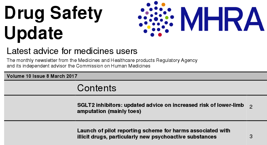 MHRA, 22 de marzo de 2017 en este número : canagliflozina y aumento del riesgo de amputación de miembros inferiores y lanzamiento de Programa piloto para para informar las sospechas de reacciones adversas a las drogas ilícitas, en particular nuevas sustancias psicoactivas.