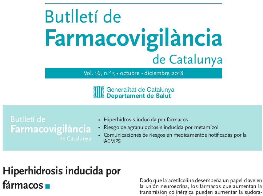 Butlletí de Farmacovigilància de Catalunya Vol. 16, n.º 5 • octubre - diciembre 2018 Cat Salut, enero de 2019 Existen varios fármacos que pueden influir en la producción de sudor, aunque pocos estudios han evaluado sus efectos de forma específica. Algunos actúan centralmente sobre el hipotálamo o los centros termorreguladores espinales, y otros sobre los ganglios simpáticos o la unión ecrino-neuroefectora. En la tabla 1 se describen los principales fármacos causantes de hiperhidrosis por los efectos que ejercen sobre la vía termorreguladora.
