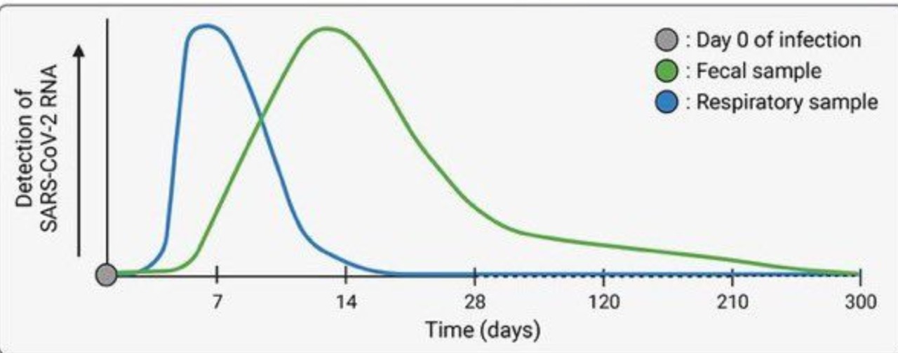 Aproximadamente la mitad de los pacientes con COVID-19 eliminan el ARN fecal en la semana posterior a la infección. El 4% de los pacientes con COVID-19 arrojan ARN viral fecal 10 meses después del diagnóstico. La presencia de ARN de SARS-CoV-2 fecal se asocia con síntomas gastrointestinales. Es probable que el SARS-CoV-2 infecte el tejido gastrointestinal. Med (N Y), 12 de abril de 2022