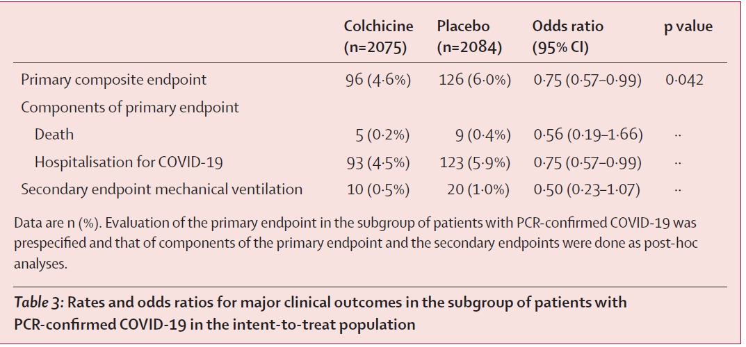 En pacientes tratados en la comunidad, incluidos aquellos sin una prueba de diagnóstico obligatoria, el efecto de la colchicina sobre los eventos clínicos relacionados con COVID-19 no fue estadísticamente significativo. Entre los pacientes con COVID-19 confirmado por PCR, la colchicina condujo a una tasa más baja de combinación de muerte o ingreso hospitalario que el placebo. Dada la ausencia de terapias administradas por vía oral para prevenir las complicaciones de COVID-19 en pacientes tratados en la comunidad y el beneficio de la colchicina en pacientes con COVID-19 probado por PCR, este agente antiinflamatorio seguro y económico podría considerarse para su uso en personas en riesgo. de complicaciones. Lancet Respir Med, 27 de mayo de 2021