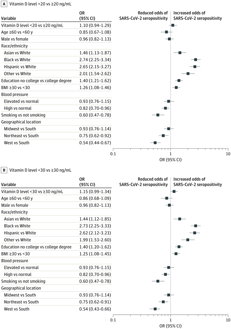 Aunque los individuos seropositivos al SARS-CoV-2 tenían niveles más bajos de vitamina D que los individuos seronegativos, los niveles bajos de vitamina D no se asociaron de forma independiente con el riesgo de seropositividad. JAMA Netw Open, 19 de mayo de 2021