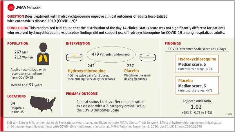 En este ensayo clínico aleatorizado que incluyó a 479 adultos hospitalizados con síntomas respiratorios de COVID-19, la distribución de la puntuación del estado clínico del día 14 (medida mediante una escala ordinal de 7 categorías) no fue significativamente diferente para los pacientes aleatorizados para recibir hidroxicloroquina en comparación con placebo (razón de posibilidades ajustada, 1,02).Estos hallazgos no apoyan el uso de hidroxicloroquina para el tratamiento de COVID-19 entre adultos hospitalizados. JAMA. 9 de noviembre de 2020