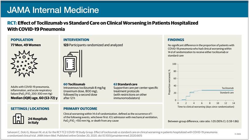 En este ensayo clínico aleatorizado de pacientes adultos hospitalizados con neumonía COVID-19 y una relación Pao2 / Fio2 entre 200 y 300 mm Hg que recibieron tocilizumab, no se observó ningún beneficio en la progresión de la enfermedad en comparación con la atención estándar. Se necesitan más ensayos clínicos aleatorios ciegos, controlados con placebo para confirmar los resultados y evaluar las posibles aplicaciones de tocilizumab en diferentes etapas de la enfermedad. JAMA Intern Med. 20 de octubre de 2020