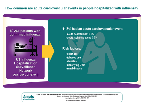 En este estudio poblacional de adultos hospitalizados con influenza, casi el 12% de los pacientes tuvo un evento cardiovascular agudo. Los médicos deben garantizar altas tasas de vacunación contra la influenza, especialmente en aquellos con afecciones crónicas subyacentes, para protegerse contra los eventos cardiovasculares agudos asociados con la influenza. Annals of Internal Medicine 25 de Agosto de 2020