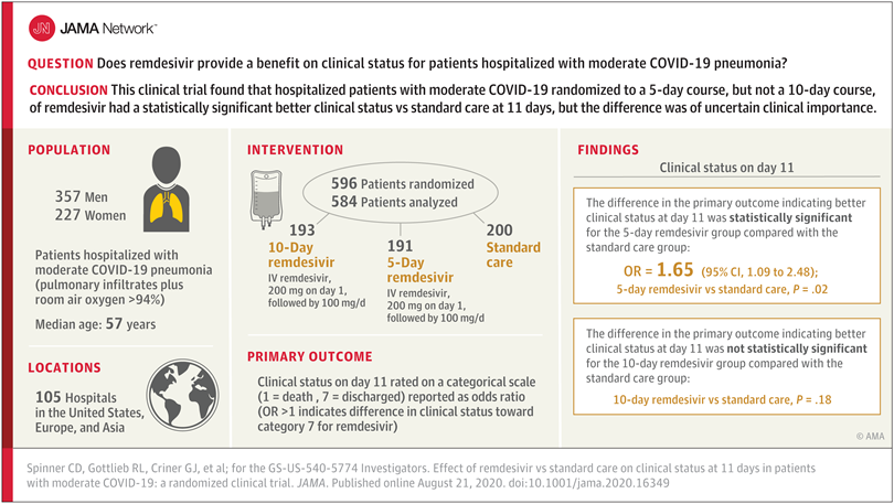 Los pacientes hospitalizados con COVID-19 moderado asignados al azar a un curso de 5 días de remdesivir tuvieron un estado clínico estadísticamente significativamente mejor en comparación con los asignados al azar a la atención estándar a los 11 días después del inicio del tratamiento, pero la diferencia fue de importancia clínica incierta. Un editorial acompañante remarca que no obstante, en conjunto, quedan cuestiones importantes sobre la eficacia del remdesivir y que parece prudente realizar con urgencia evaluaciones adicionales de remdesivir en ECA a gran escala diseñados para abordar las incertidumbres residuales e informar su uso óptimo. JAMA. 21 de agosto de 2020.