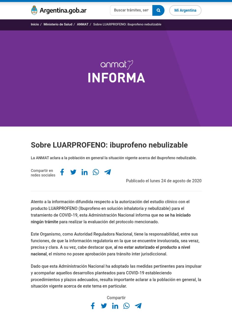 La ANMAT aclara a la población en general la situación vigente acerca del ibuprofeno nebulizable: no se ha iniciado ningún trámite para realizar la evaluación del protocolo mencionado.24 de agosto de 2020