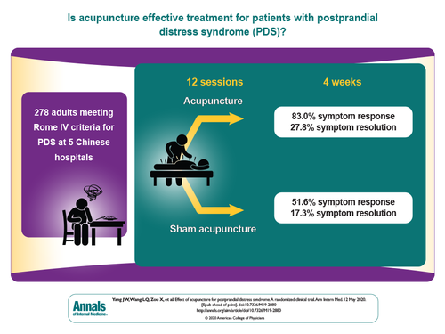Entre los pacientes con SDP, la acupuntura resultó en un aumento de la tasa de respuesta y la tasa de eliminación de los 3 síntomas cardinales en comparación con la acupuntura simulada, con una eficacia sostenida durante 12 semanas en pacientes que recibieron acupuntura tres veces por semana durante 4 semanas. Ann Intern Med. 12 de mayo de 2020
