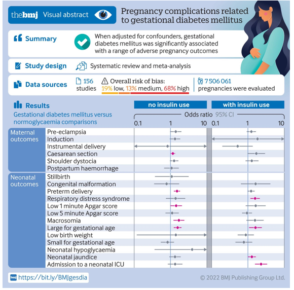 Cuando se ajustó por factores de confusión, la diabetes mellitus gestacional se asoció significativamente con complicaciones del embarazo. Los hallazgos contribuyen a una comprensión más integral de los resultados adversos del embarazo relacionados con la diabetes mellitus gestacional. Los futuros estudios primarios deberían considerar de forma rutinaria el ajuste para un conjunto más completo de factores pronósticos. BMJ 25 de mayo de 2022