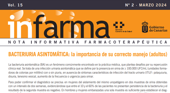 La bacteriuria asintomática (BA) no es una enfermedad, ni causa daño renal. El tratamiento antimicrobiano de esta entidad no reduce el porcentaje de pacientes que desarrollan una infección del tracto urinario sintomática posterior y no modifica la supervivencia con respecto a los pacientes no tratados. Numerosos estudios han demostrado que no existe beneficio en la detección sistemática y tratamiento de la BA en ancianos en términos de morbimortalidad.. Infarma, 25 de marzo de 2024