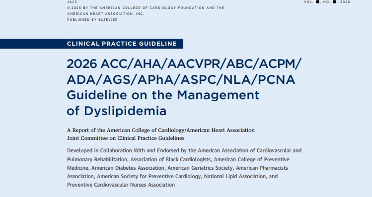 La “Guía de 2026 sobre el manejo de la dislipidemia” de la ACC/AHA/AACVPR/ABC/ACPM/ADA/AGS/APhA/ASPC/NLA/PCNA reemplaza a la “Guía 2026 sobre el Manejo de la Dislipidemia”. El objetivo de la guía es abordar de forma práctica la evaluación, el manejo y el seguimiento de pacientes con dislipidemias, incluyendo colesterol alto, hipertrigliceridemia y lipoproteína (a) elevada [Lp(a)]. Esta guía, se ha modificado para reflejar la comprensión en constante evolución del riesgo de ECVA asociado a lipoproteínas aterogénicas más allá de las partículas LDL, incluyendo TG y partículas remanentes, y Lp(a). J Am Coll Cardiol. 13 de marzo de 2026