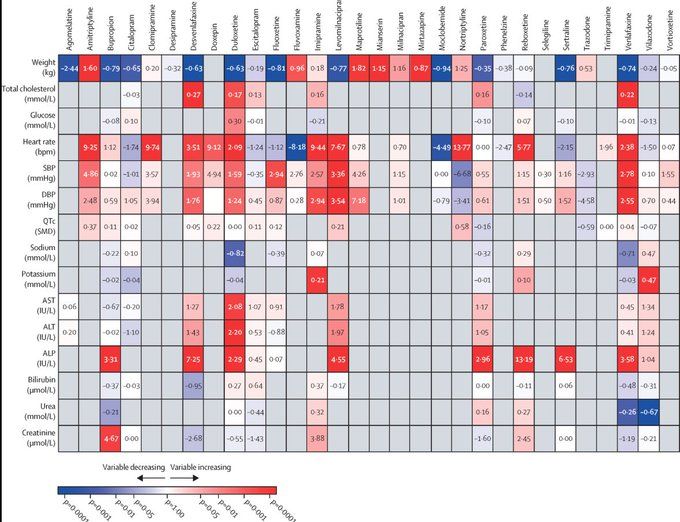 Pillinger T, Arumuham A, McCutcheon RA, D'Ambrosio E, Basdanis G, Branco M, Carr R, Finelli V, Furukawa TA, Gee S, Heald A, Jauhar S, Ma Z, Mancini V, Moulton C, Salanti G, Taylor DM, Tomlinson A, Young AH, Efthimiou O, Howes OD, Cipriani A. The effects of antidepressants on cardiometabolic and other physiological parameters: a systematic review and network meta-analysis. Lancet. 2025 Nov 1;406(10515):2063-2077. doi: 10.1016/S0140-6736(25)01293-0.