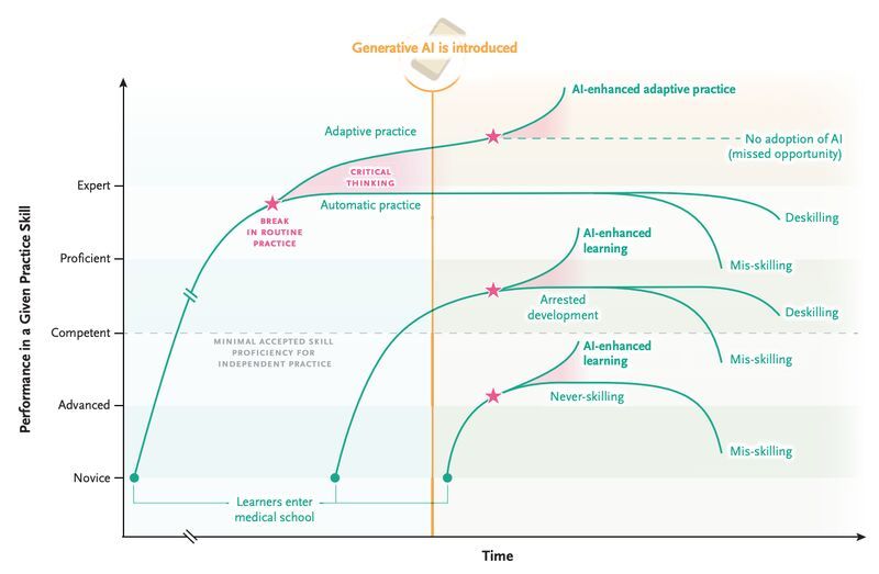 Los LLM pueden simular la generación de conocimiento y el razonamiento clínico con una fluidez similar a la humana, lo que les da la apariencia de agencia y procesamiento independiente de la información. Por lo tanto, la IA tiene la capacidad de transformar fundamentalmente el aprendizaje y la práctica médica. Al igual que en otras profesiones, el uso de la IA en la formación médica podría resultar en profesionales altamente eficientes, pero menos capaces de resolver problemas de forma independiente y realizar evaluaciones críticas que sus homólogos pre-IA.