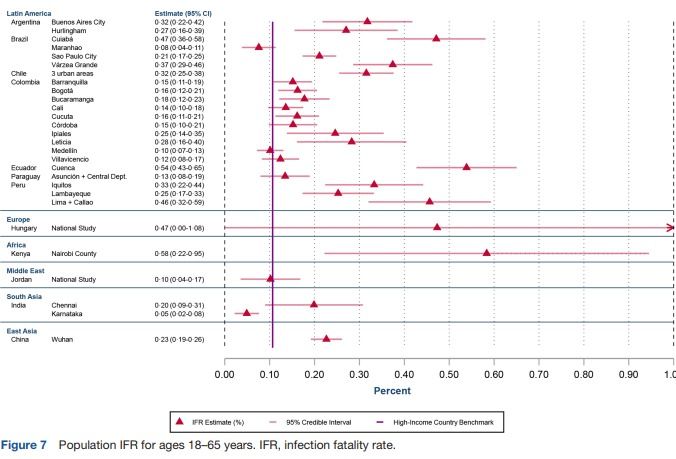 ⇒ De hecho, la IFR de la población en los países en desarrollo es similar a la de los países de altos ingresos, porque las diferencias en la estructura de edad de la población se compensan aproximadamente con las disparidades en el acceso a la atención médica y las tasas elevadas de infección entre las cohortes de mayor edad.