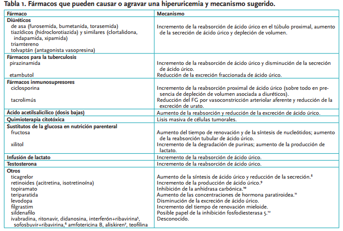 La hiperuricemia, que se define como una concentración plasmática de ácido úrico por encima de los 7 mg/dl en hombres y de los 6 mg/dl en mujeres, es una manifestación clínica frecuente.1 Muchas veces es asintomática, pero un 10% de los pacientes pueden presentar crisis de gota como consecuencia del depósito de cristales de urato monosódico en el líquido sinovial y la consiguiente inflamación de las zonas articulares, periarticulares y subcutáneas.2 Además del alcohol y los alimentos ricos en purinas, los fármacos también tienen un papel importante en la patogenia de la hiperuricemia. Algunos pueden aumentar las concentraciones de ácido úrico al incrementar su reabsorción y/o disminuir su secreción, y otros también pueden aumentar su producción (véase la tabla 1).3