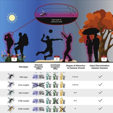 Algunas personas atraen más a los mosquitos que otras, pero la base mecánica de este fenómeno es poco conocida. Probamos la atracción de los mosquitos por el olor de la piel humana e identificamos a las personas que son excepcionalmente atractivas o poco atractivas para los mosquitos. Estas diferencias se mantuvieron estables durante varios años. El análisis químico reveló que las personas muy atractivas producen significativamente más ácidos carboxílicos en las emanaciones de su piel. Mosquitos mutantes que carecen de los correceptores quimiosensoriales Ir8a , Ir25a o Ir76b estaban gravemente afectados por la atracción por el olor humano, pero conservaban la capacidad de diferenciar a las personas muy atractivas de las poco atractivas. El vínculo entre los ácidos carboxílicos elevados en el olor de la piel humana "imán de mosquitos" y los fenotipos de mutaciones genéticas en los receptores de ácido carboxílico sugiere que dichos compuestos contribuyen a la atracción diferencial de los mosquitos. Comprender por qué algunos humanos son más atractivos que otros proporciona información sobre qué olores de la piel son más importantes para el mosquito y podría informar el desarrollo de repelentes más efectivos.