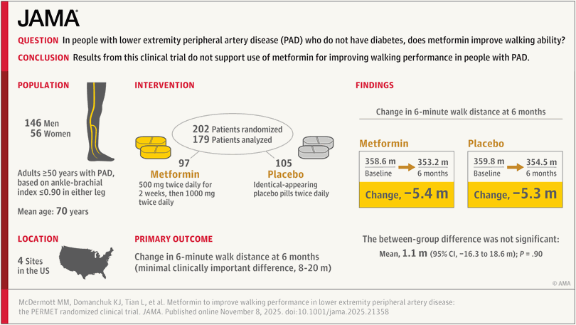 McDermott MM, Domanchuk KJ, Tian L, et al. Metformin to Improve Walking Performance in Lower Extremity Peripheral Artery Disease: The PERMET Randomized Clinical Trial. JAMA. Published online November 08, 2025. doi:10.1001/jama.2025.21358