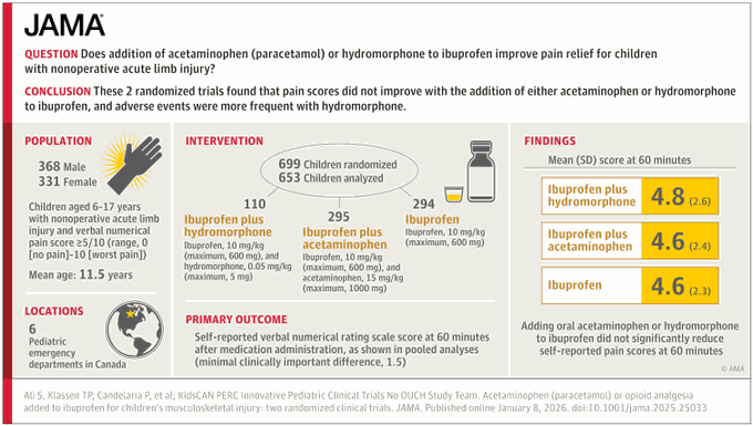Ali S, Klassen TP, Candelaria P, et al. Acetaminophen (Paracetamol) or Opioid Analgesia Added to Ibuprofen for Children’s Musculoskeletal Injury: Two Randomized Clinical Trials. JAMA. Published online January 08, 2026. doi:10.1001/jama.2025.25033