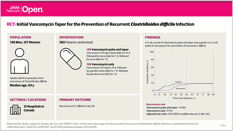 McDonald EG, Butler-Laporte G, Brophy JM, et al.; TAPER-V Team. Initial Vancomycin Taper for the Prevention of Recurrent Clostridioides difficile Infection: A Randomized Clinical Trial. JAMA Netw Open. 2026 Feb 2;9(2):e2560495. doi: 10.1001/jamanetworkopen.2025.60495