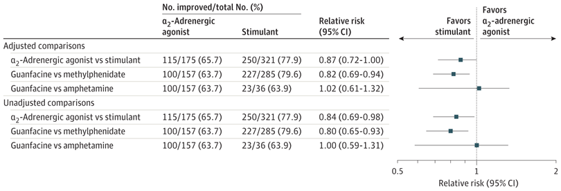 En esta revisión retrospectiva de los registros de salud de niños en edad preescolar con TDAH tratados en prácticas pediátricas de desarrollo conductual, se observó una mejoría en la mayoría de los niños que recibieron agonistas o estimulantes adrenérgicos α2, con diferentes perfiles de efectos adversos entre clases de medicamentos . Se necesitan más investigaciones, incluidas las de ensayos clínicos aleatorios, para evaluar la eficacia comparativa de los agonistas adrenérgicos α2 frente a los estimulantes. JAMA, 4 de mayo de 2021