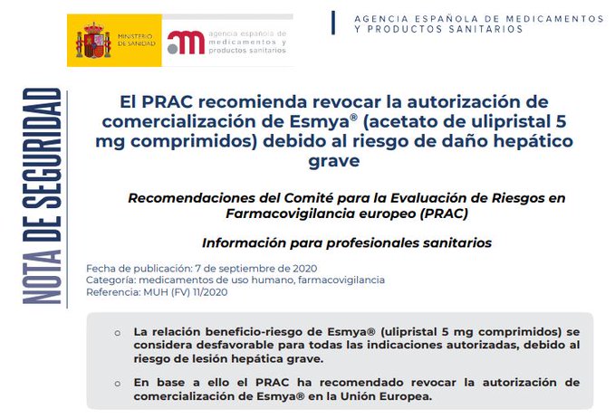 Recomendaciones del Comité para la Evaluación de Riesgos en Farmacovigilancia europeo (PRAC) La relación beneficio-riesgo de Esmya® (ulipristal 5 mg comprimidos) se considera desfavorable para todas las indicaciones autorizadas, debido al riesgo de lesión hepática grave.En base a ello el PRAC ha recomendado revocar la autorización de comercialización de Esmya® en la Unión Europea. AEMPS, 7 de septiembre de 2020