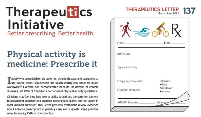 Los médicos pueden sentir que les falta tiempo o capacidad para abordar las barreras comunes para prescribir ejercicio, y las prescripciones de ejercicio (ExRx) no se enseñan en la mayoría de los planes de estudios médicos. Este boletín presenta evidencia de revisión sistemática sobre prescripciones de ejercicio en la atención primaria y sugiere algunas prácticas maneras de emplear ExRx en su práctica..Therapeutics Letter 137, 13 de julio de 2022
