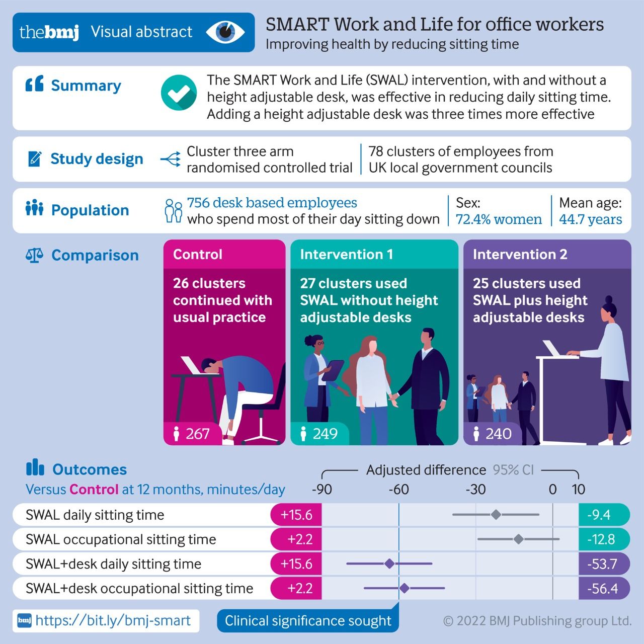 Las intervenciones evaluadas en este ensayo controlado aleatorizado de grupo de tres brazos [Stand More AT Work and Life (SWAL) y SWAL plus desk (SWAL más escritorio)] se asociaron con una reducción del tiempo sentado, aunque se encontró que agregar un escritorio de altura ajustable era tres veces más efectivo. BMJ 17 de agosto de 2022