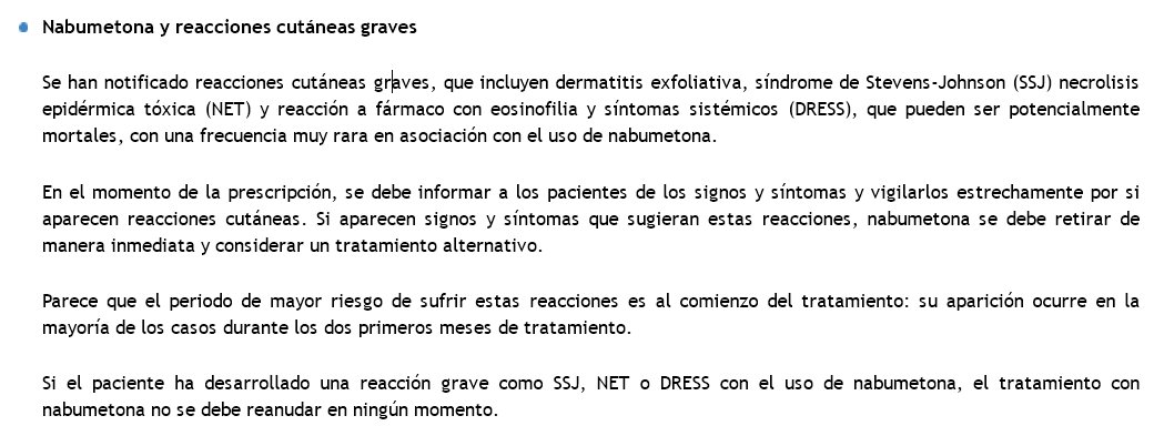 AEMPS, 8 de agosto de 2018 Se han notificado reacciones cutáneas graves, que incluyen dermatitis exfoliativa, síndrome de Stevens-Johnson (SSJ) necrolisis epidérmica tóxica (NET) y reacción a fármaco con eosinofilia y síntomas sistémicos (DRESS), que pueden ser potencialmente mortales, con una frecuencia muy rara en asociación con el uso de nabumetona.