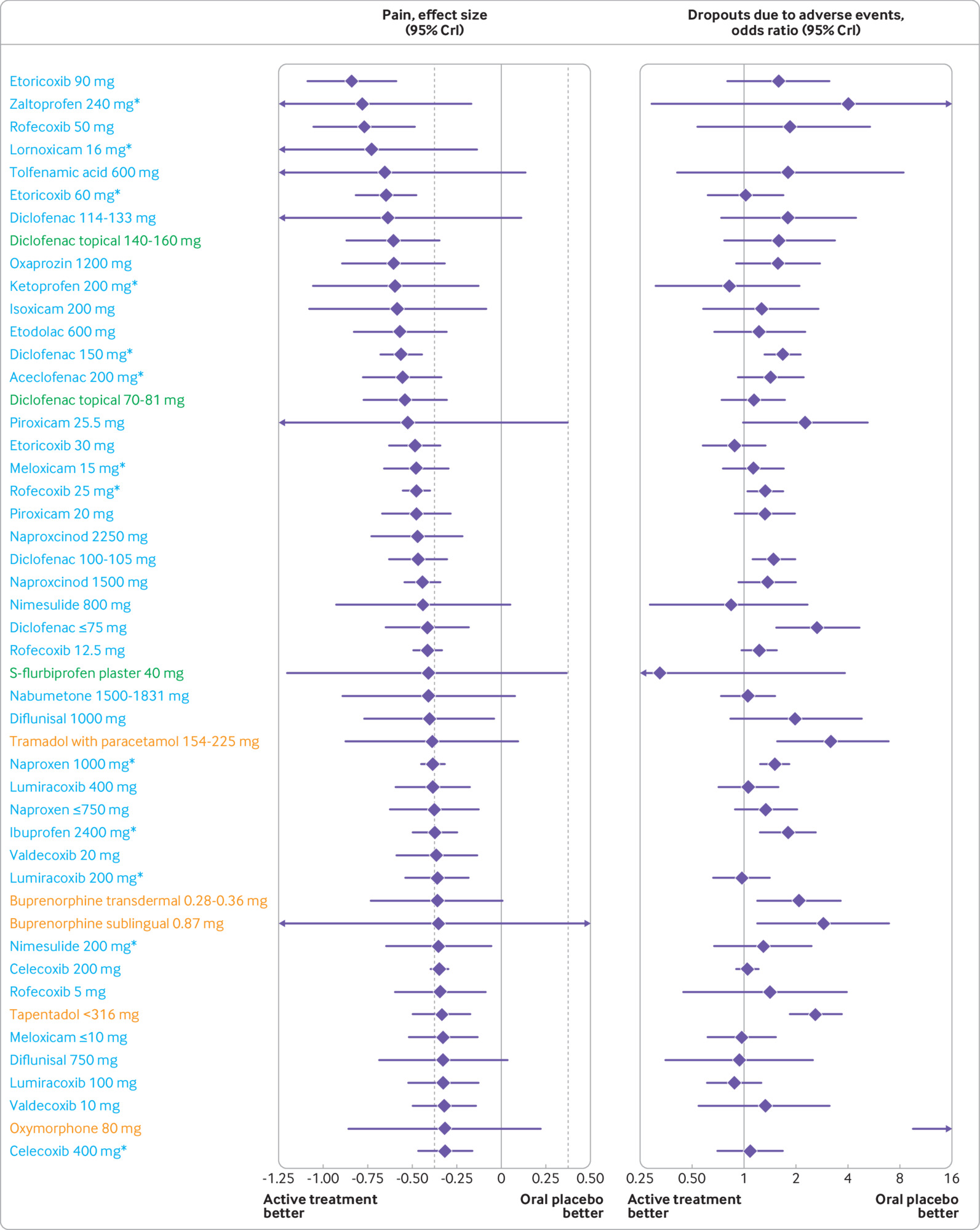 Etoricoxib 60 mg/día y diclofenac 150 mg/día parecen ser los AINE orales más eficaces para el dolor y la función en pacientes con artrosis. Pero, estos tratamientos probablemente no sean apropiados para pacientes con comorbilidades o para uso a largo plazo por un ligero aumento en el riesgo de eventos adversos. Hay un mayor riesgo de abandono debido a eventos adversos con el diclofenac. El diclofenac tópico 70-81 mg/día parece ser eficaz y más seguro y debe considerarse como tratamiento farmacológico de primera línea para la artrosis de rodilla. El balance beneficio/riesgo de los opioides es negativo. BMJ, 12 de octubre de 2021