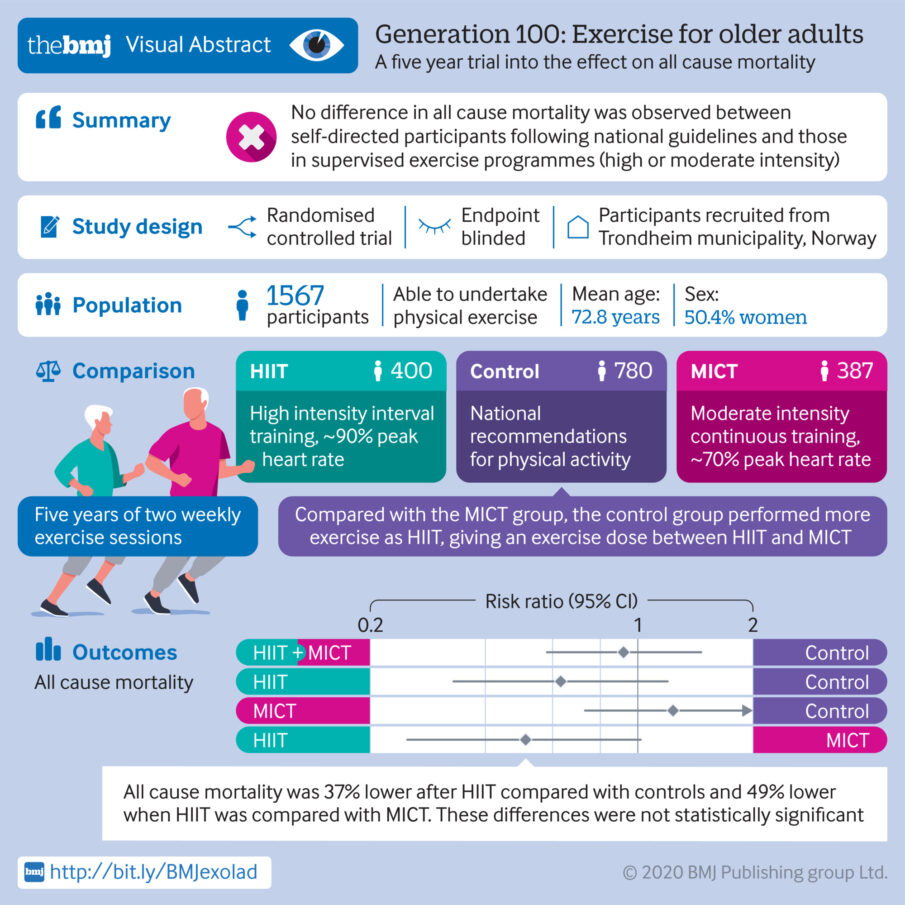 La combinación de ejercicio a intervalos de moderada intensidad al 70% de la frecuencia cardíaca máxima (MICT) y de alta intensidad al 90% de la frecuencia cardíaca máxima (HIIT), no tiene ningún efecto sobre la mortalidad por todas las causas en comparación con los niveles de actividad física recomendados. Sin embargo, observamos una tendencia de mortalidad por todas las causas más baja después de HIIT en comparación con los controles y MICT.BMJ, 7 de octubre de 2020
