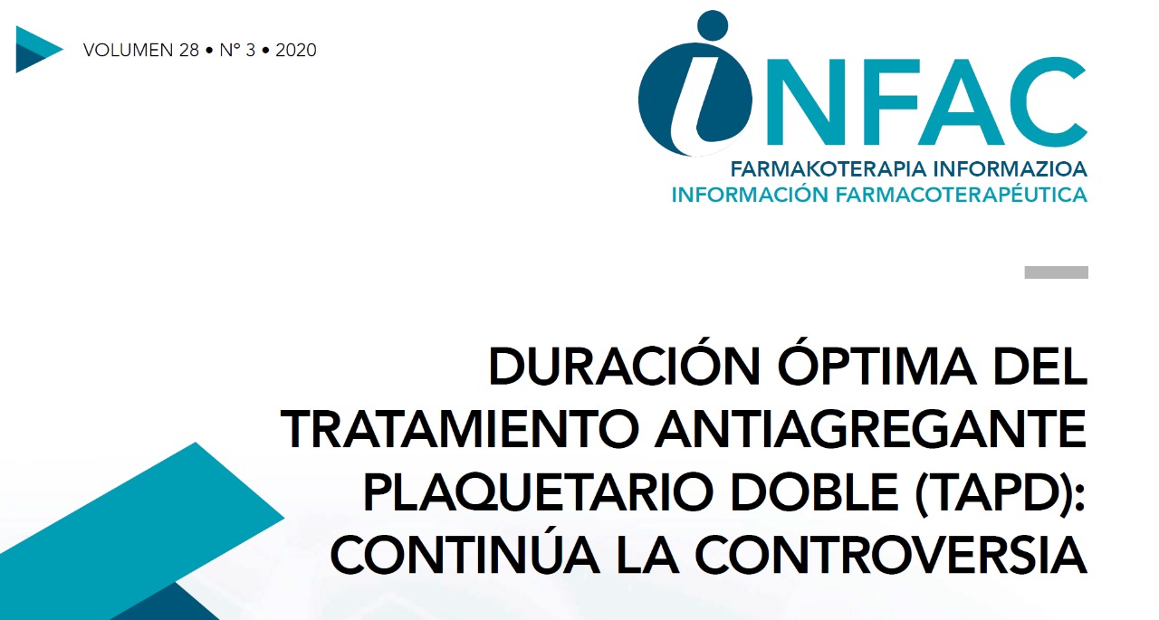 El objetivo de este boletín es revisar las recomendaciones actuales sobre la duración óptima del TAPD según la guía de la European Society of Cardiology (ESC 2017 )1 por ser la utilizada en nuestro medio, incorporando aspectos prácticos a tener en cuenta en el manejo de estos pacientes en atención primaria. Boletín INFAC Volumen28, nº 3, 2020, 27 de octubre de 2020