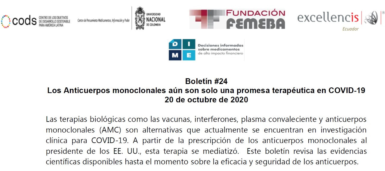 Las terapias biológicas como las vacunas, interferones, plasma convaleciente y anticuerpos monoclonales (AMC) son alternativas que actualmente se encuentran en investigación clínica para COVID-19. A partir de la prescripción de los anticuerpos monoclonales al presidente de los EE. UU., esta terapia se mediatizó. Este boletín revisa las evidencias científicas disponibles hasta el momento sobre la eficacia y seguridad de los anticuerpos. DIME BOLETÍN #24, 20 de octubre de 2020