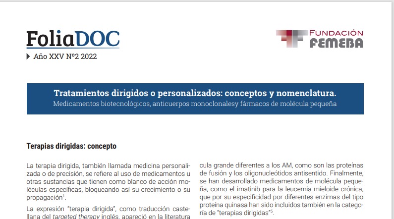 Esta breve revisión de los aspectos básicos de las terapias dirigidas está orientada al médico de atención primaria, quien, aunque rara vez estará en situación de indicar estos tratamientos, los encuentra con frecuencia creciente en sus pacientes y debe convivir con la posibilidad de efectos adversos y de interacciones farmacológicas. Se repasarán sus propiedades farmacológicas, su nomenclatura y sus principales áreas de aplicación, dedicando un apartado final a las controversias que genera la autorización por vía acelerada de nuevos fármacos con eficacia cuestionable y el impacto de estos medicamentos de alto costo en el presupuesto sanitario. Folia DOC Año XXV Nº2 2022, Fundación FEMEBA, 15 de noviembre de 2022