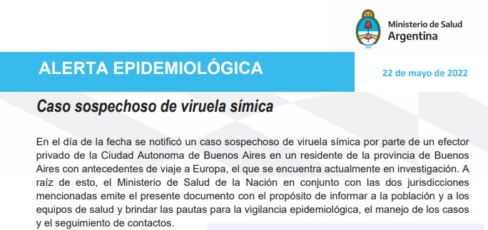 En el día de la fecha se notificó un caso sospechoso de viruela símica por parte de un efector privado de la Ciudad Autónoma de Buenos Aires en un residente de la provincia de Buenos Aires con antecedentes de viaje a Europa, el que se encuentra actualmente en investigación. A raíz de esto, el Ministerio de Salud de la Nación en conjunto con las dos jurisdicciones mencionadas emite el presente documento con el propósito de informar a la población y a los equipos de salud y brindar las pautas para la vigilancia epidemiológica, el manejo de los casos y el seguimiento de contactos. , Ministerio de salud de la Nación 22 de mayo de 2022