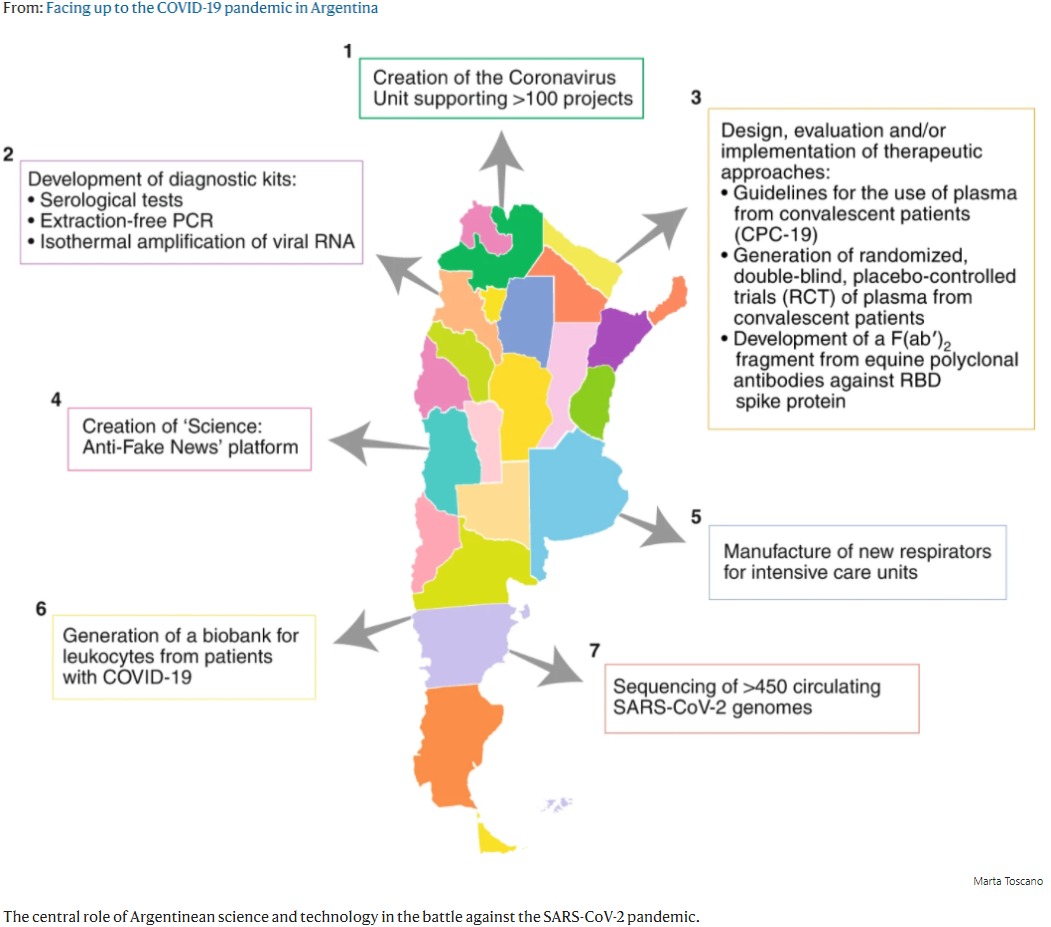 En este artículo dos destacados investigadores de Argentina ( Gabriel Rabinovich y Jorge Geffner) comentan las contribuciones de la ciencia en nuestro país para enfrentar alcoronavirus. Desde el inicio de la pandemia SARS-CoV-2 y luego de la creación de la 'Unidad de Coronavirus', los científicos y tecnólogos argentinos han contribuido liderando iniciativas de investigación básica y traslacional, incluido el desarrollo de kits de diagnóstico y serológicos, el diseño de nuevos enfoques terapéuticos, el establecimiento de plataformas, ejecutando ensayos clínicos e implementando medidas sociales para proteger a los grupos más vulnerables de la población. Nature Immunology, 24 de febrero de 2021