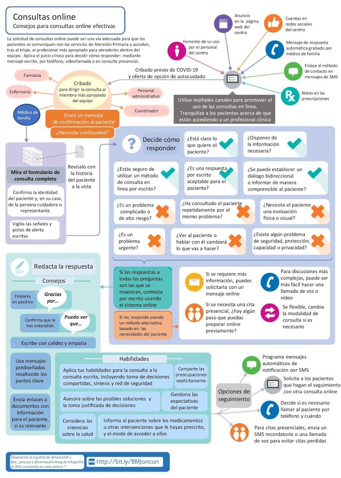 El BMJ publicó un artículo sobre cómo realizar consultas escritas online con los pacientes en APS. Se plantea que la consulta en línea debe formar parte de un modelo dinámico de asistencia en atención primaria, y no un servicio aislado o independiente. Se trata de integrar esta modalidad de consulta en la prestación general de servicios sanitarios, un cambio en la práctica habitual que requiere la implicación, y formación, de profesionales y pacientes. Infografía y texto adaptado por Sano y Salvo, 9 de marzo de 2021