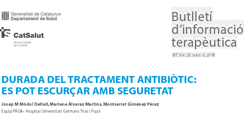 Butlletí d’informació terapèutica Vol. 29, núm. 6 BIT., 4 de octubre de 2018 Estamos asistiendo a un cambio de paradigma. Hay suficiente evidencia para recomendar tratamientos cortos en la infección del tracto urinario, en la neumonía adquirida en la comunidad y en la asociada a ventilación mecánica, en la infección intraabdominal, en la otitis media aguda y en la sinusitis aguda bacteriana. Sin embargo, se debe tener en cuenta que pacientes no son candidatos a tratamientos cortos . En este Boletín se revisan las duraciones recomendadas para las diferentes patologías. .
