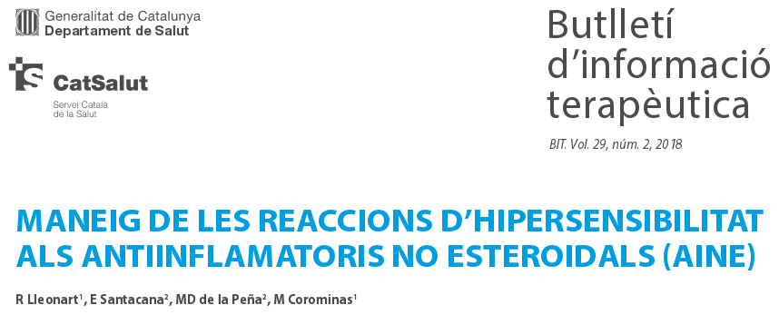 BIT. Vol. 29, núm. 2, 2018 GenCat, agosto de 2018 Los pacientes con reacciones adversas por hipersensibilidad inducidas por AINE representan un colectivo heterogéneo con una expresión clínica muy diversa. Los AINE son la primera causa de hipersensibilidad a fármacos. Las reacciones de hipersensibilidad a AINE son reacciones adversas tipo B (impredecibles que ocurren en individuos susceptibles) según la clasificación de la OMS.