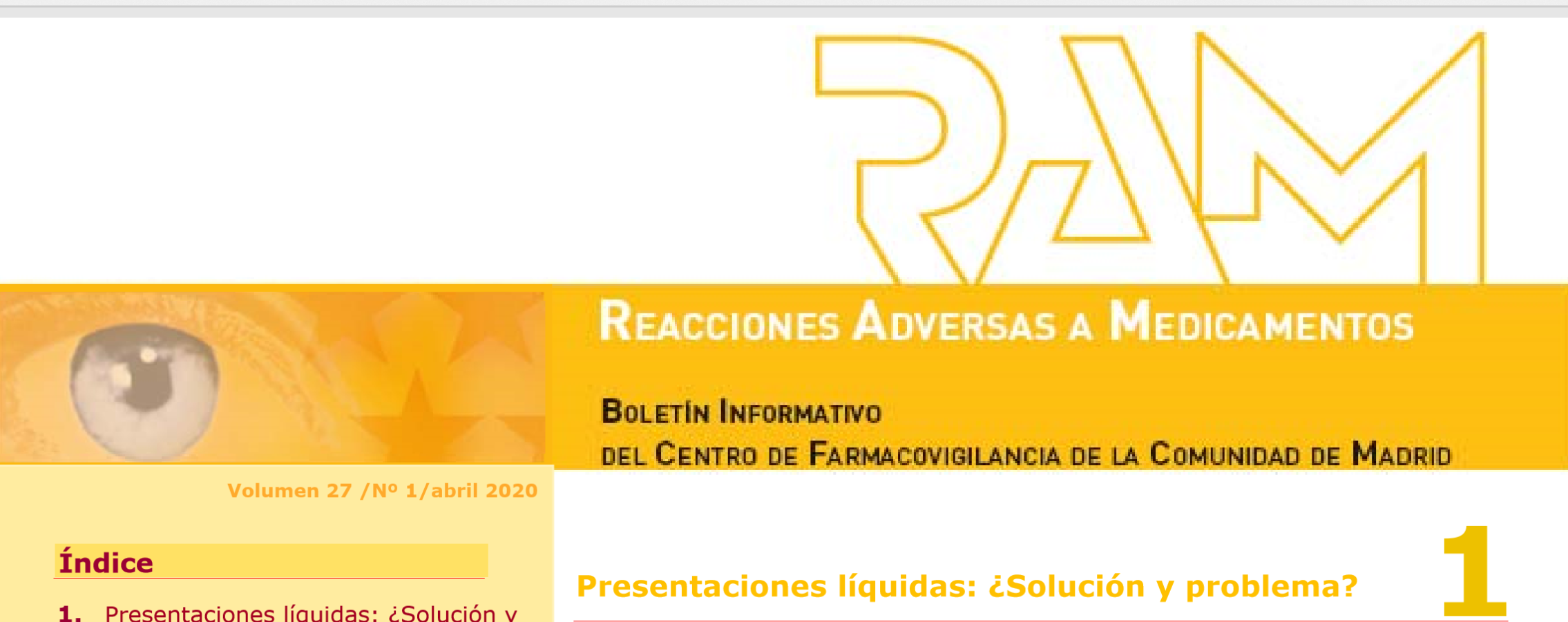 Boletín RAM, 27 /Nº 1/abril 2020Centro de Farmacovigilancia de la Comunidad de Madrid,13 de abril de 2020 Las presentaciones líquidas para administración oral permiten individualizar la dosis y facilitan la administración de medicamentos en determinados grupos de edad y condiciones de salud. Sin embargo, conllevan la posibilidad de errores nointencionados en la dosis administrada por problemas específicos en relación con la presentación líquida.