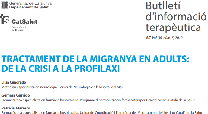 El tratamiento de la migraña se fundamenta en el control de los factores desencadenantes y los relacionados con la cronificación, en el tratamiento sintomático de las crisis y en el tratamiento preventivo. El tratamiento sintomático debe prescribir a todos los pacientes, mientras que el preventivo se reserva para los más graves. BIT. Vol. 30, núm. 5, 2019Departament de Salut, Servei Català de la Salut.