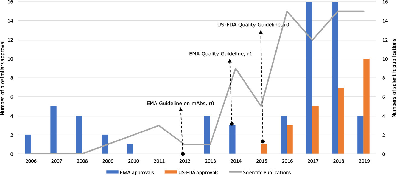 Las evaluaciones de biosimilaridad de los atributos de calidad (QA) se han publicado en publicaciones científicas revisadas por pares para aproximadamente el 60% de los biosimilares aprobados. La dinámica de las publicaciones y los tipos de QA de informes aumentaron con el tiempo en paralelo con un mayor número de biosimilares con licencia y parece verse afectada por el desarrollo de pautas regulatorias en 2012-2015.La disponibilidad de una evaluación completa, públicamente accesible (acceso abierto) e imparcial de biosimilaridad de QA podría contribuir a una mayor confianza y aceptación de biosimilares en la práctica clínica. Eur J Pharm Sci, 30 de julio de 2020