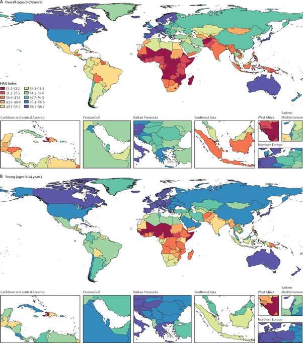 Desempeño del Índice de calidad y acceso a la atención de la salud, en general y por grupos de edad seleccionados, para 204 países y territorios, 1990-2019
