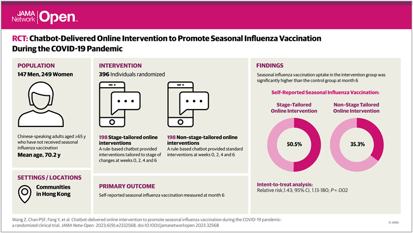 Intervención en línea realizada por chatbot para promover la vacunación contra la influenza estacional durante la pandemia de COVID-19: un ensayo clínico aleatorizado.