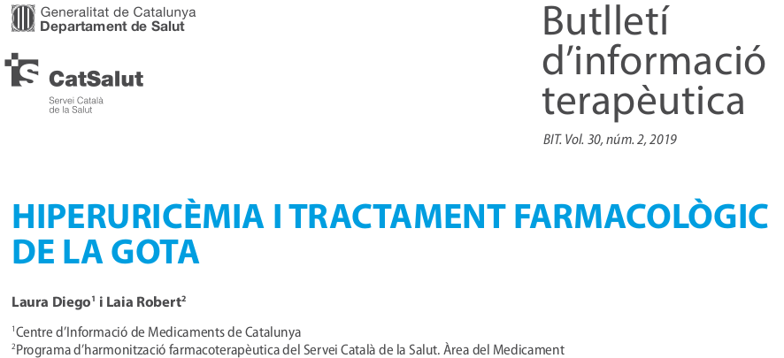 Butlletí d’informació terapèutica BIT. Vol. 30, núm. 2, 2019CatSalut, 10 de mayo de 2019Este Boletín revisa los tratamientos farmacológicos de los ataques agudos de gota y de la hiperuricemia haciendo un posicionamiento de los fármacos disponibles. Finalmente, se abordan diferentes controversias relacionadas con el tratamiento como el manejo de la hiperuricemia asintomática o la retirada del alopurinol.