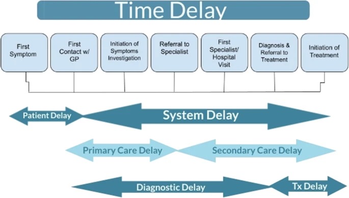 Argentina tiene la segunda tasa de mortalidad por cáncer de mama (CM) más alta de América del Sur. La incidencia estandarizada por edad de cáncer de mama en Argentina es de 73 por 100.000. A pesar de la disponibilidad de servicios de detección temprana, el 30% de los CM se diagnostican en estadios avanzados de la enfermedad. Se describe el "Estudio de la encuesta Tiempo 1". El tiempo 1 se define como el tiempo desde la primera aparición de signos o síntomas de CM hasta la primera consulta dentro del sistema público de salud J Cancer Educ. 2021