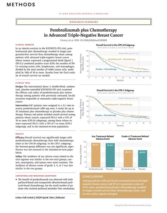 Entre los pacientes con cáncer de mama triple negativo avanzado cuyos tumores expresaron ligando 1 de muerte programada (PD-L1) con un una combinación puntuación positiva (CPS) de 10 o más, la adición de pembrolizumab a la quimioterapia resultó en una supervivencia general significativamente más prolongada que la quimioterapia sola. N Engl J Med. 21 de julio 2022