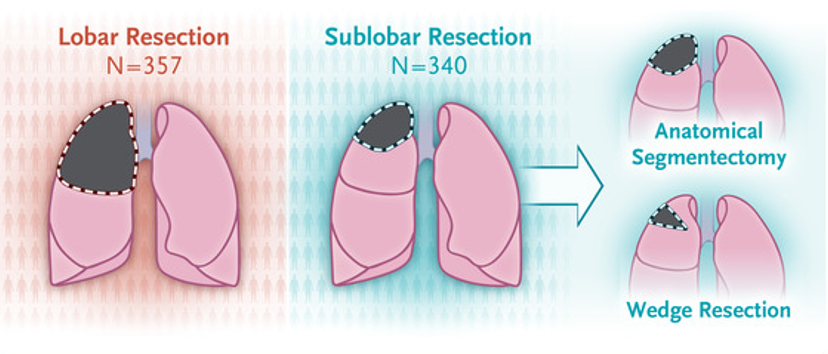 En pacientes con cáncer de pulmón de células no pequeñas , de localización periférica, tumor de hasta 2 cm y sin compromiso ganglionar hiliar ni mediastínico, la resección sublobar no fue inferior a la lobectomía con respecto a la supervivencia libre de enfermedad. La supervivencia global fue similar con los dos procedimientos. New England Journal of Medicine, 9 de febrero de 2023.